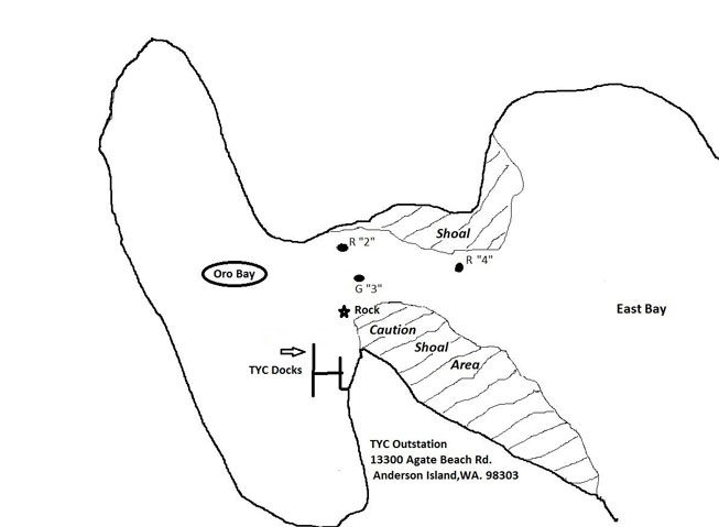 Approaching the Oro Bay Outstation from east to west, skippers must be aware of the shoal extending from the left shore to a small GREEN buoy (indicated in red on the diagram), keeping both the shoal and the buoy to PORT. Once comfortably beyond the buoy, the docks ast the outstation may be approached in a direct manner - always mindful of the shoal area at the entrance. Deeper draft yachts should favor the outboard moorages due to shallow low tide levels in board. Use Chart 18448 or the printable Booklet Chart 18448.