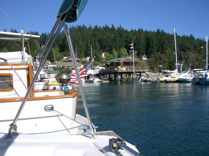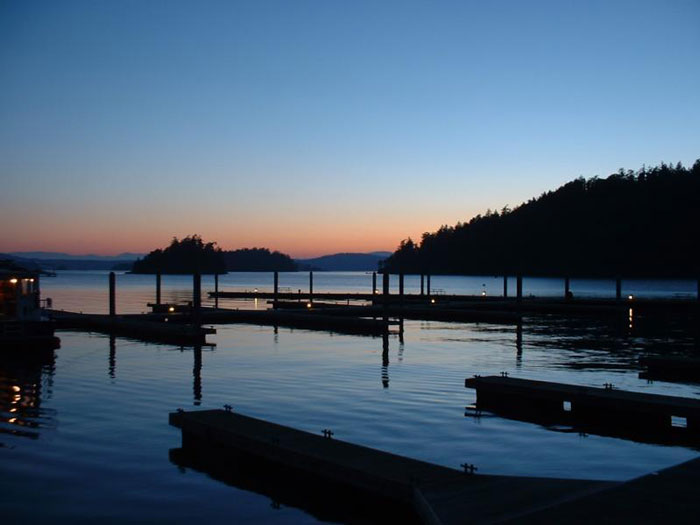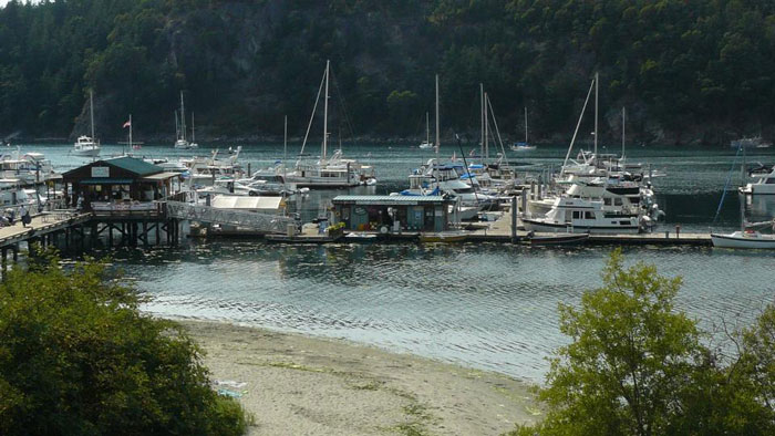 Our most northern outstation is located on Orcas Island in the San Juans. Use Chart 18434 or the printable Booklet Chart 18434. We have 104 feet of dock space at the end of "B" dock at the Deer Harbor Marina and Resort. Water, 30 amp power and trash receptacles are provided along with pay showers. Limited boat washing. Members may use the resort swimming pool except when posted closed or for maintenance. Access to a 15 passenger van is available upon request to the Marina Office as well as other rental cars and services.