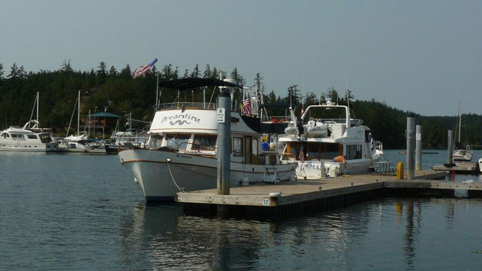 Our most northern outstation is located on Orcas Island in the San Juans. Use Chart 18434 or the printable Booklet Chart 18434. We have 104 feet of dock space at the end of "B" dock at the Deer Harbor Marina and Resort. Water, 30 amp power and trash receptacles are provided along with pay showers. Limited boat washing. Members may use the resort swimming pool except when posted closed or for maintenance. Access to a 15 passenger van is available upon request to the Marina Office as well as other rental cars and services.
